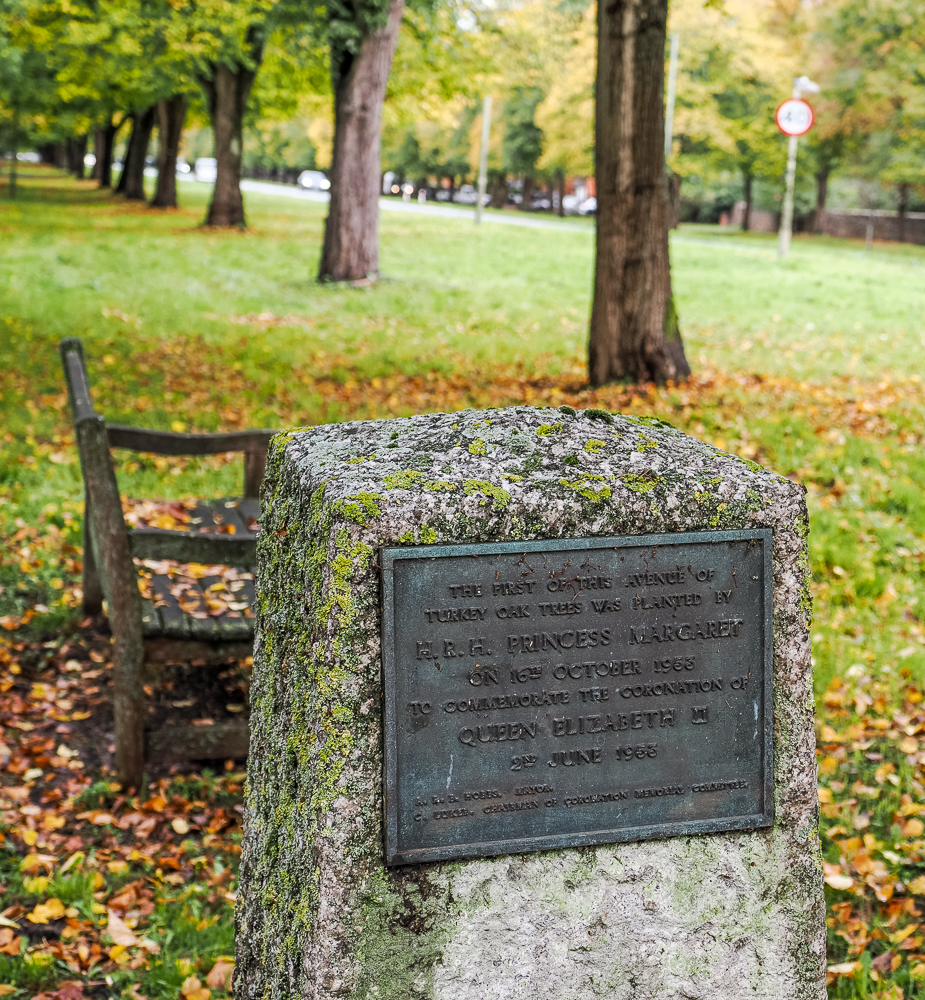 The plaque mounted next to one of several public bench seats states: “The first of this avenue of Turkey Oak trees was planted by HRH Princess Margaret on 16th October 1953 to commemorate the Coronation of Queen Elizabeth II on 2nd June 1953”. Turkey Oaks are a broadleaved, deciduous ornamental tree from elsewhere in Europe that yield bright dangly catkins in spring. However, the Ministry of Defence ordered the felling of all such trees on its UK bases in 1998 because it was discovered that they host gall wasps whose larvae damage native oaks.