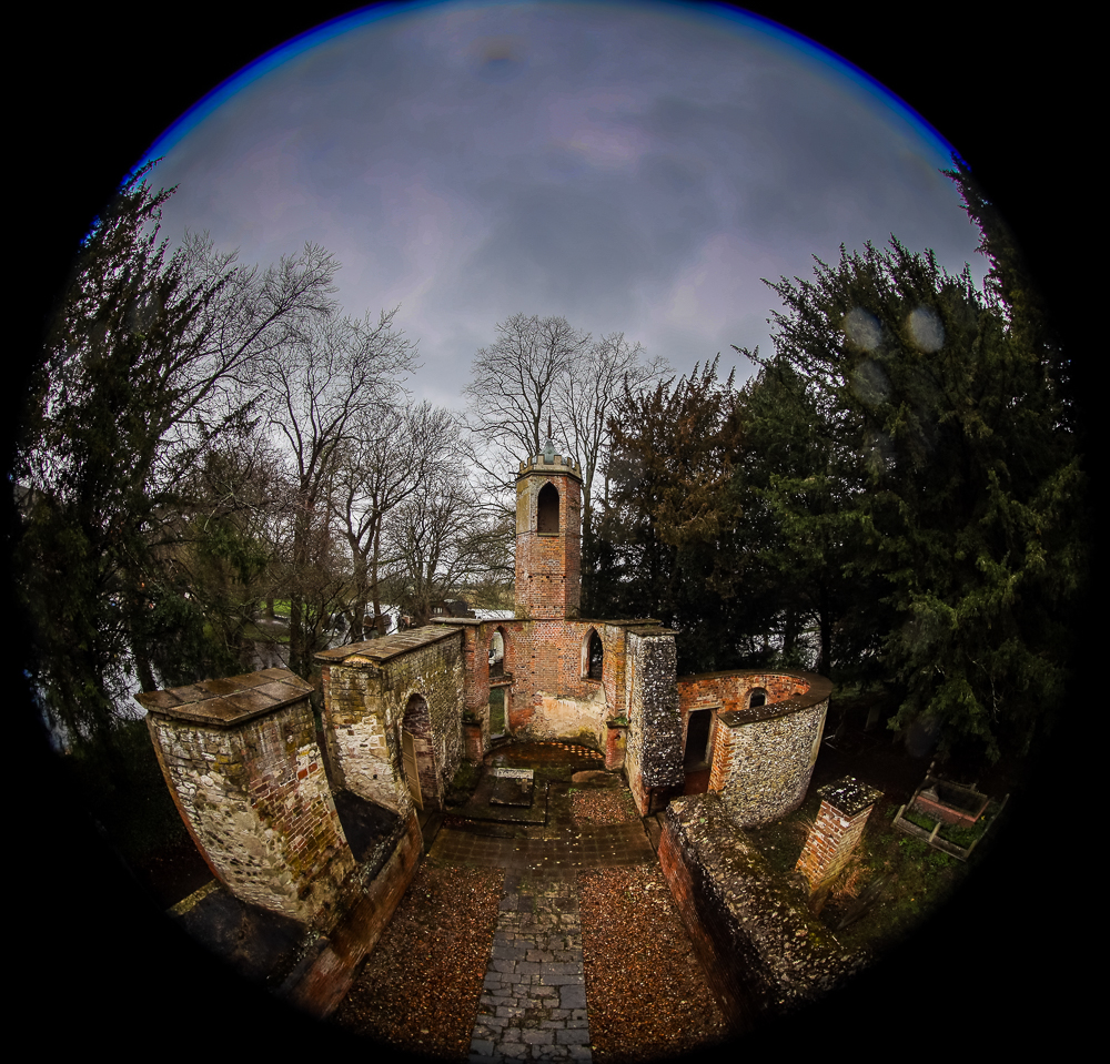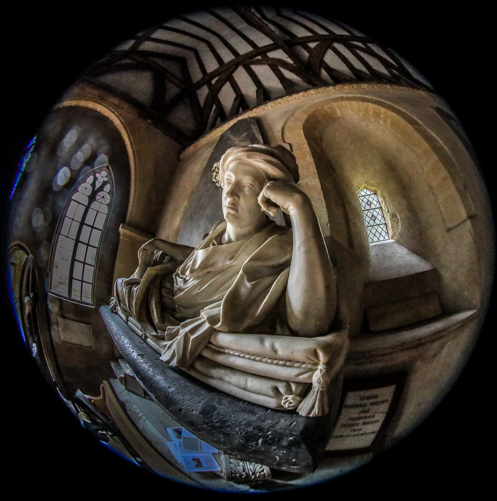 Here are both a telephoto and an ultra-wide angle lens view of the fine sculpture inside the part of this church which is still protected from the weather, as well as an overall view from above. This is because most of this church’s roof is missing! As you walk from nearby Crowmarsh direction towards this peculiar building, signs point out that the public footpath is surrounded by private property and notices such as “Caution guard dogs on patrol” contrast with “The Churches Conservation Trust: St John the Baptist, Mongewell. Church open today”. Much of this private land was once the Carmel College which closed in 1997. The distinctive designs of the synagogue, dining hall, amphitheatre and boathouse can still be glimpsed. The old manor house within the grounds here was used by Agatha Christie as the basis for her mansion in her murder mystery play The Mousetrap. This is now in its 75th year in London! The site has also been a location for film shoots, including part of The Iron Lady.